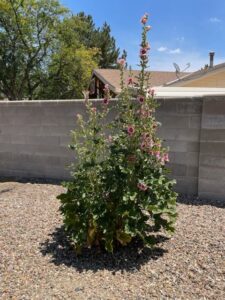 A hollyhock in my side yard loves the environment. It receives just the right amount of shade and sun to thrive. This year, it has grown almost as tall as a tree. It stands two feet taller than the six-and-a-half foot cement wall between my yard and the rest of the neighborhood. It has a good view of everything happening on the other side of that wall.